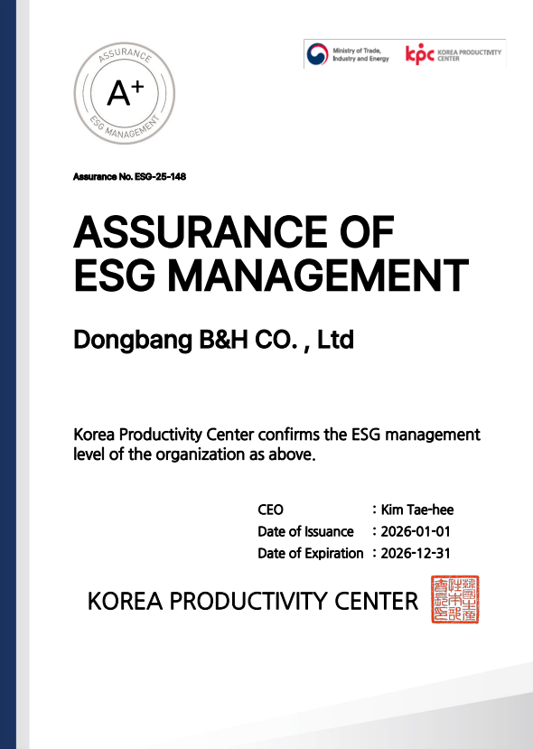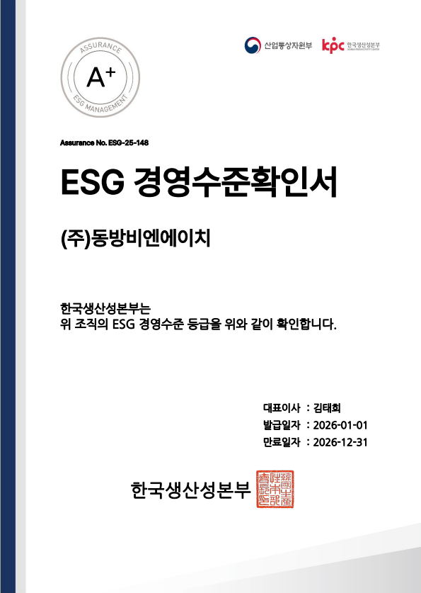 동방비앤에이치가 한국생산성본부에서 시행한 ESG 경영수준 등급 진단결과,