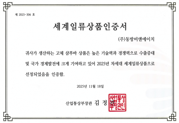산업통상부에서 주관하고 KOTRA / 대한화장품협회에서 주최한 대한민국 세계일류상품 선정위원회에서 동방의 샴푸바 제품을 선정하여, 11월18일 롯데호텔에서 수여식 행사가 있었습니다.